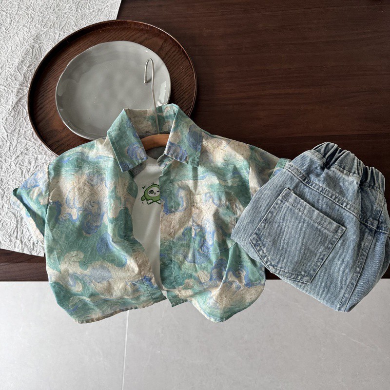 Boys Shirt 2024 New Handsome 100 Summer Thin Children’s High Quality Cotton Short Sleeve Flower Shirt