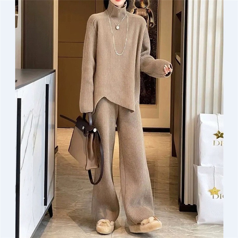 French fashion age-reducing knitted suit women’s autumn and winter sweater turtleneck top + high waist casual wide leg pants two-piece set