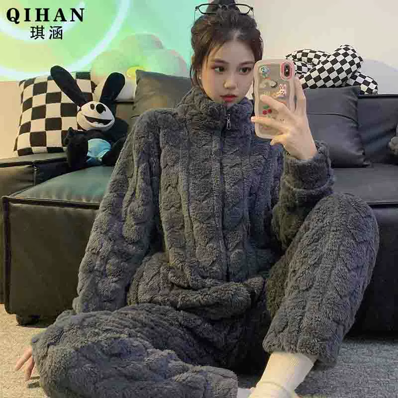 High collar zipper casual gray two-piece set of coral velvet pajamas for women winter thickened and velvet 2024 new internet celebrity