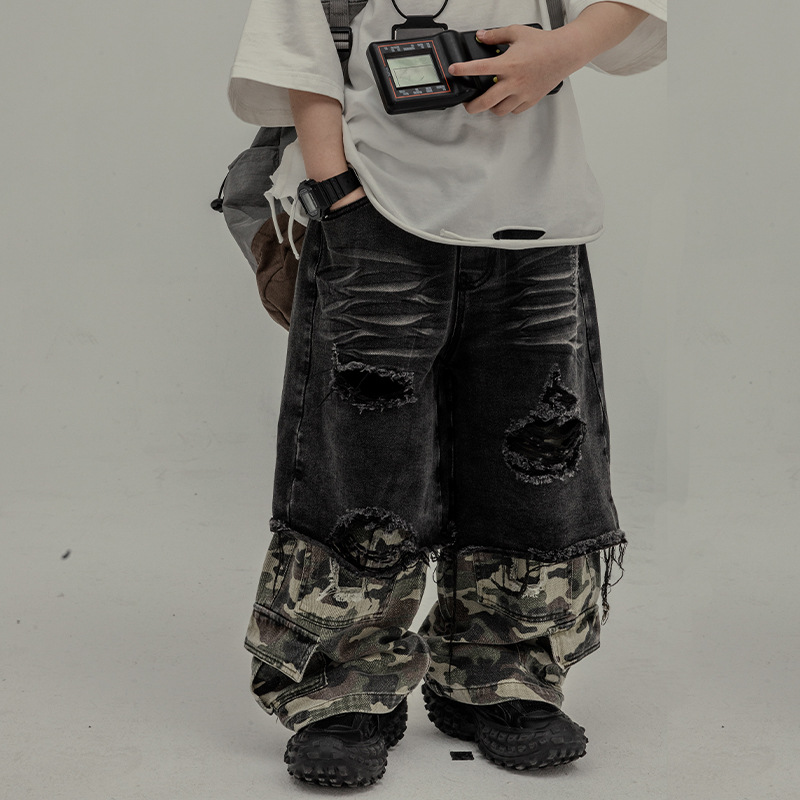 Yihong clothing boys’ jeans 2024 Spring Children’s trousers camouflage stitching fake two-piece heavy-duty functional pants