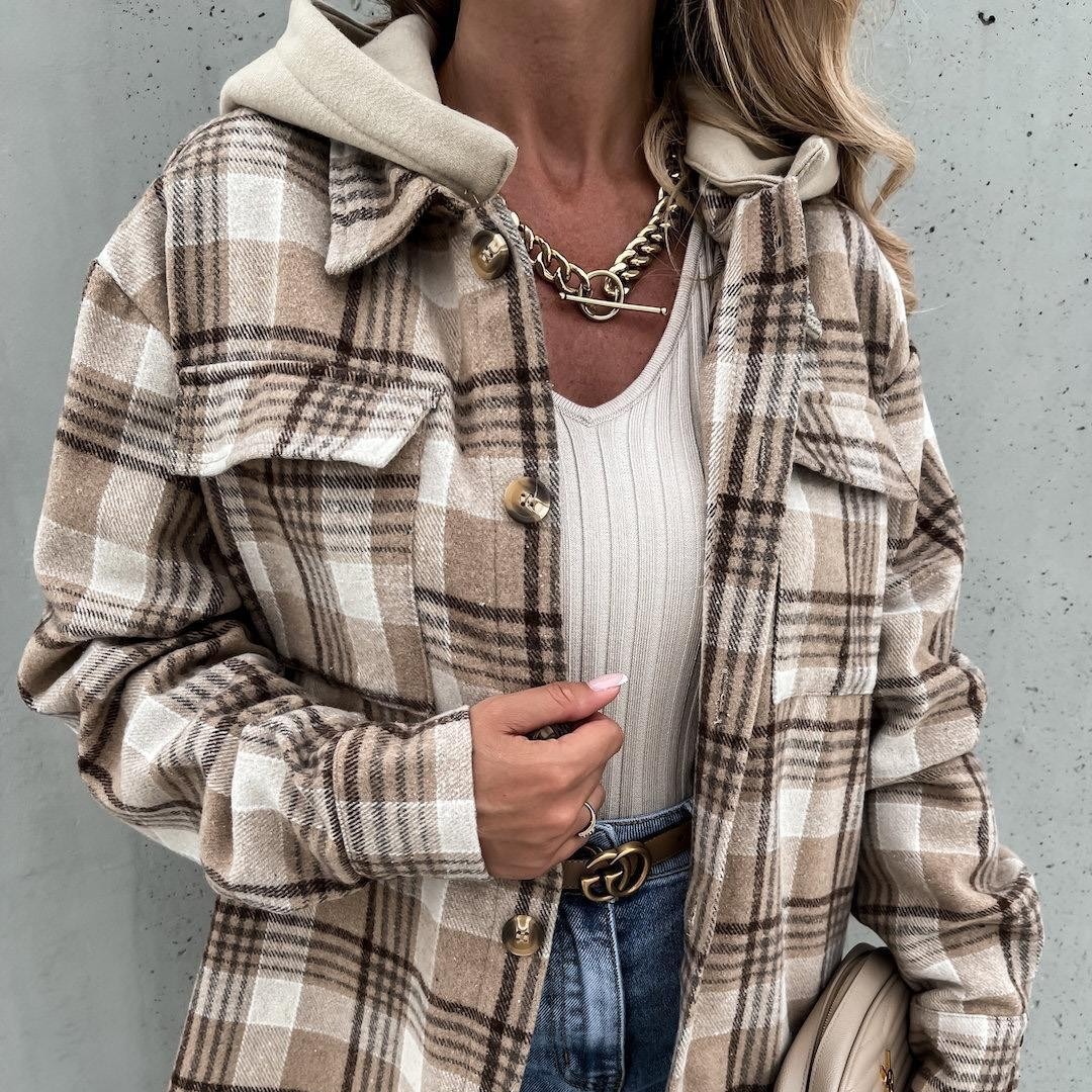Cross-border European and American Foreign Trade Women’s Autumn and Winter New Amazon Hooded Loose Plaid Button Shirt Jacket
