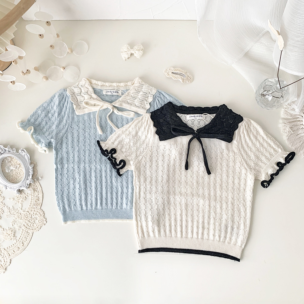 Cutemil spring and summer ins baby girl pullover lapel sweater baby thin hollow color contrast cute knitted short sleeve