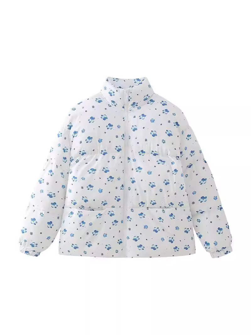 Cross-border wholesale 2024 spring new European and American fashion women’s stand collar printed zipper loose white cotton-padded jacket coat