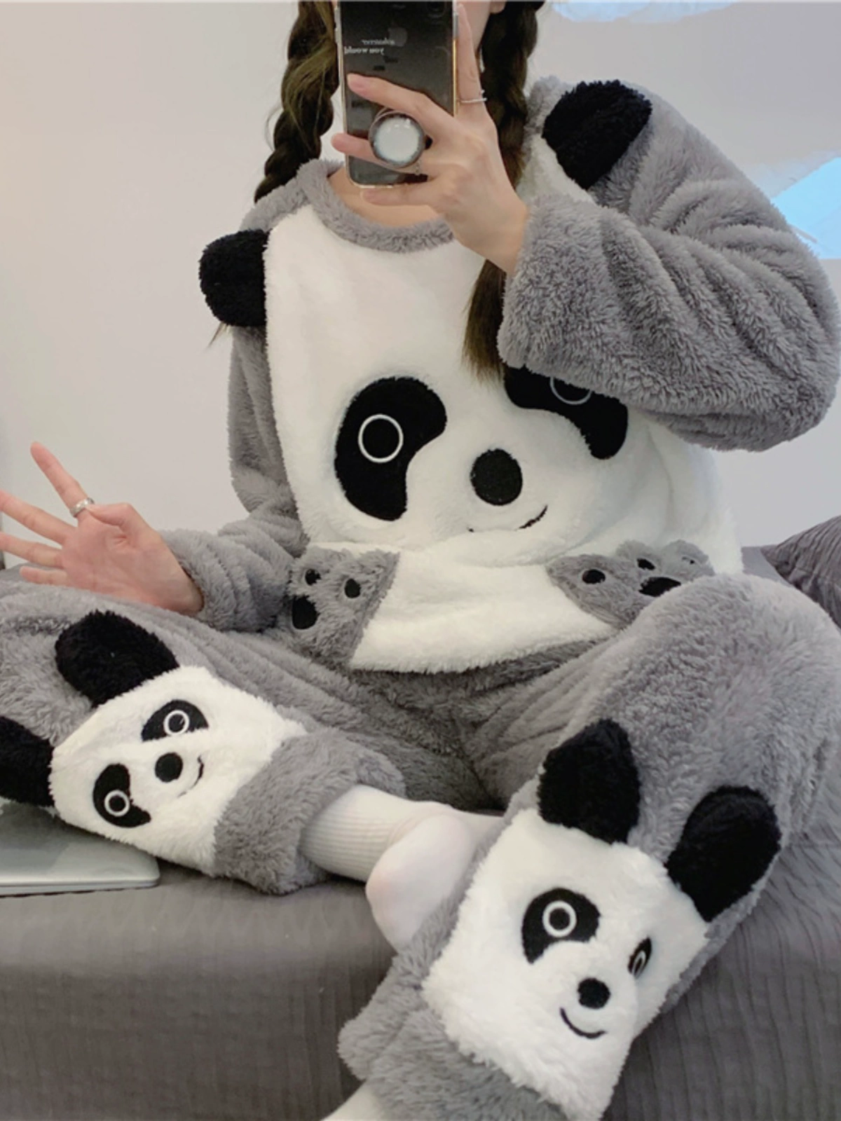 Gray and White Panda Pajamas Winter Women’s 2025 New Flannel Plus Velvet Thickened Autumn and Winter Coral Velvet Home Clothes