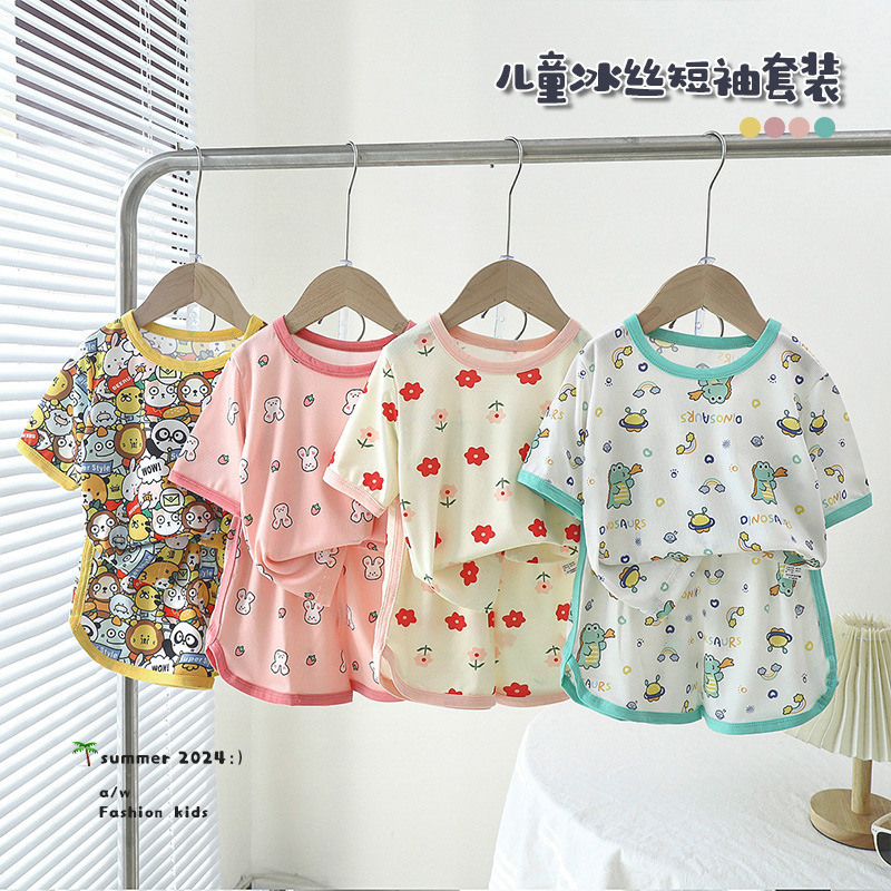 Children’s short-sleeved shorts suit girls’ summer ice silk small floral printed home wear baby boy cartoon short-sleeved T