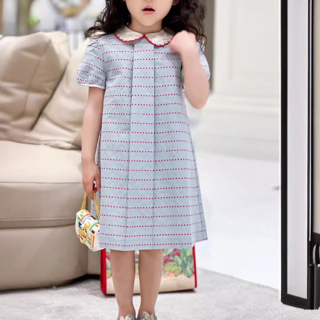 Factory in stock Summer 2024 Girls Printed Comfortable A- Line Skirt Kids Blue Embroidered Academy Style Cotton dress