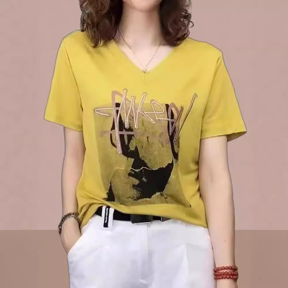 220g threaded cotton printed fashionable women’s T-shirt short sleeve new V-neck women’s summer bottoming shirt high-grade repair