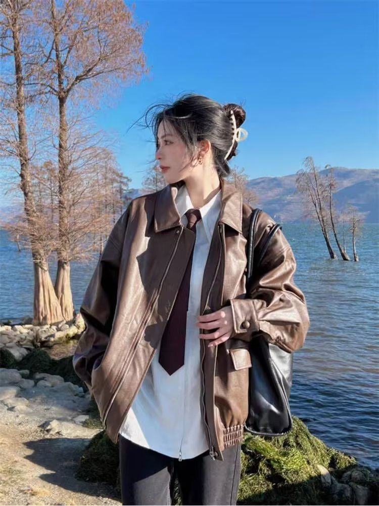 American Retro Black PU Leather Coat Women’s Spring and Autumn Fried Street Small Loose Bike Suit Leather Jacket Top