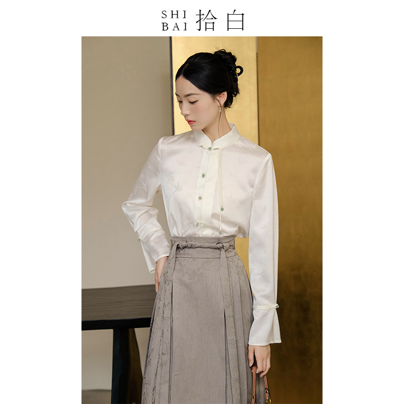 SHIBAI White New Chinese Style Shirt Original National Style Women’s Daily Commuting High-end Acetic Jacquard Zen Top