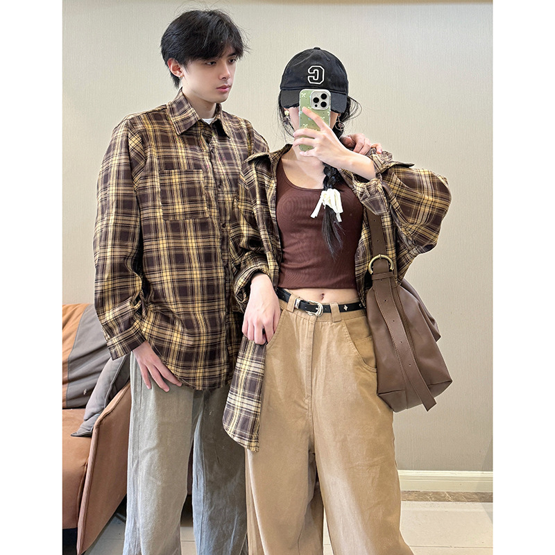 2024 Couple Clothing Summer Vintage Plaid Men’s and Women’s Long-sleeved Shirt Design Sense Lazy Style Loose Anti-sunscreen