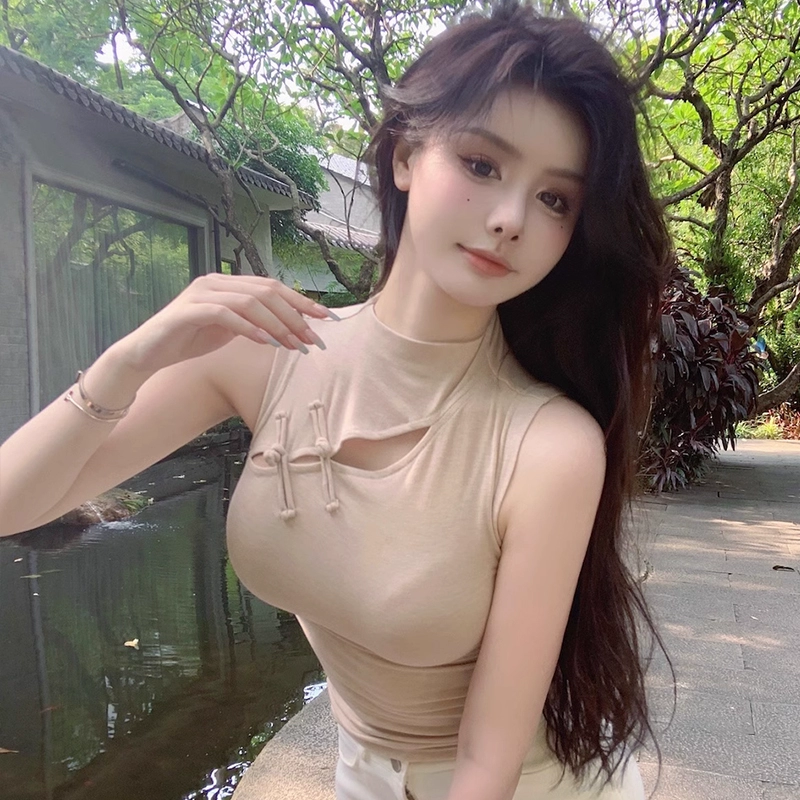 Small turtleneck sleeveless vest top showing chest T-shirt cheongsam
