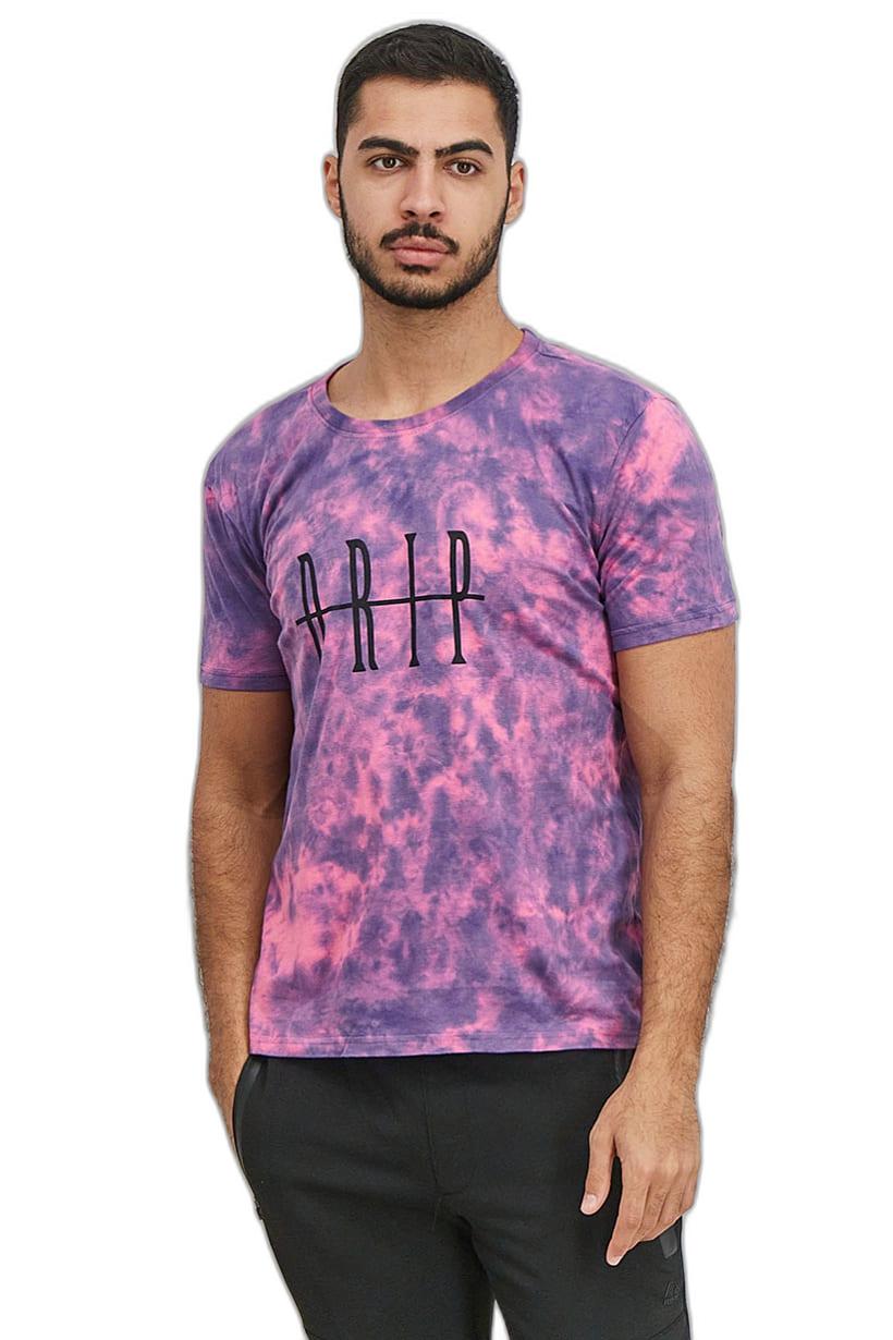 Purple and pink tie-dye graphic print crew neck t-shirt for men with short sleeves.