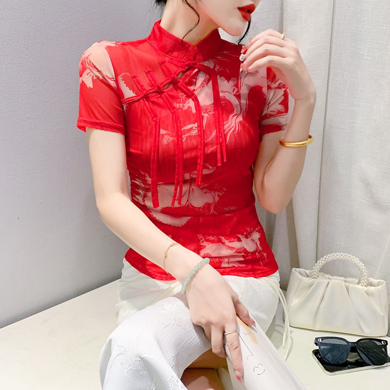 Elegant Slim-fit Slimming Stylish Age-reducing Top Summer New Chinese-style Mesh Button-up Collar Short-sleeved Printed T-shirt for Women