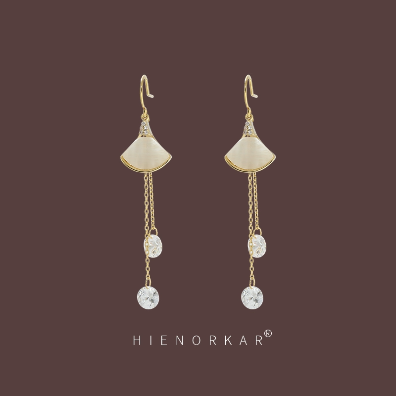 Korean temperament long earrings 2022 new trend imitation cat’s eye stone fan-shaped zircon earrings design ear hooks