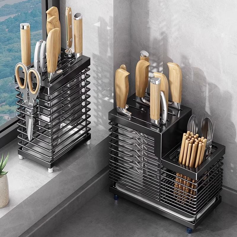 Stainless Steel Kitchen Knife Holder Storage Rack Household Desktop Vegetable Knife Supplies Chopsticks Bucket Integrated Wall-mounted Storage Rack