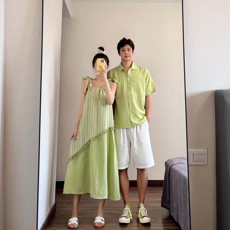 Sanya Seaside Travel Vacation Style Couple Clothes Summer New Stitching Sling dress One Dress One Skirt Men’s Shirt