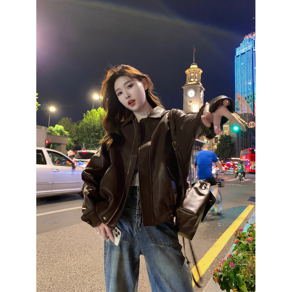Brown Leather Jacket Women’s Spring Korean Style 2024 New Arrival Spicy Cool Girl Biker Clothes Loose Long Sleeve Jacket Top