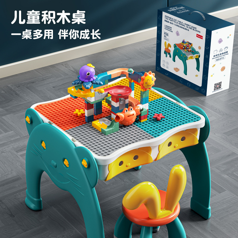 Block table multi -function storage compatible universal assembly game Children’s toys, wooden tables and chairs small large particles
