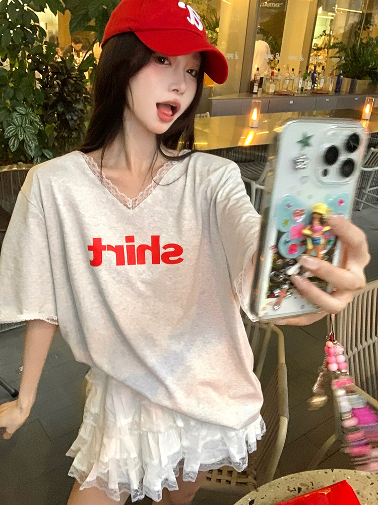 Letter printed summer loose casual v-neck short-sleeved T-shirt