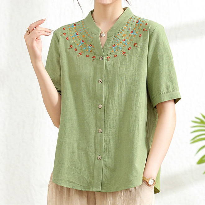 Middle-aged mother summer cotton linen suit western style new middle-aged summer fashion thin short-sleeved top women’s shirt
