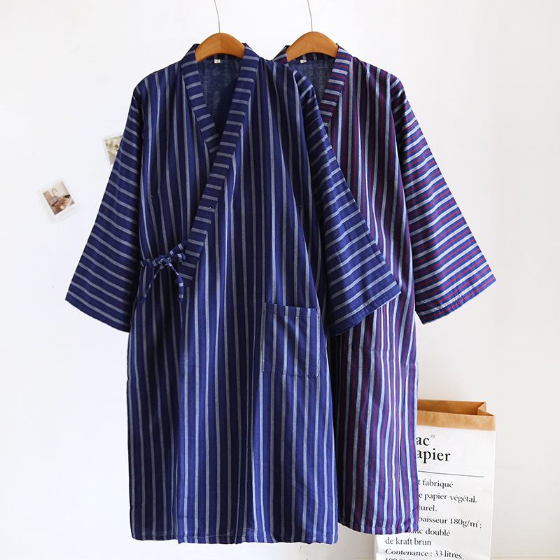 Japanese Style Double-Layer Pure Cotton Gauze Men’s Kimono Lace-Up Nightgown Spring and Autumn Thin Striped Bathrobe Home Clothes Pajamas