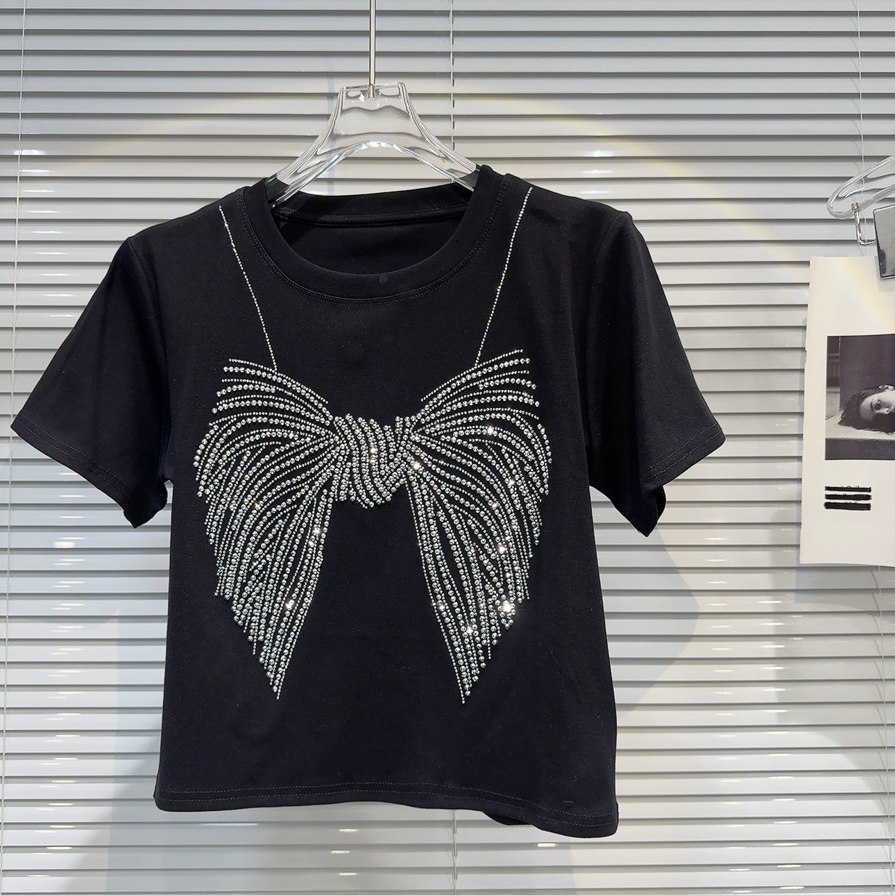 Internet celebrity summer niche navel-baring short-sleeved hot diamond bow tie