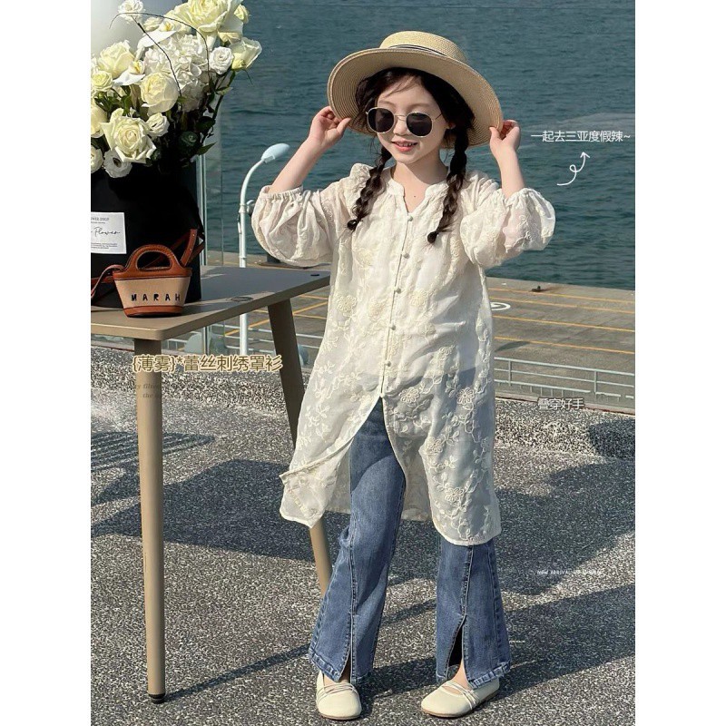Children’s Wear Girls’ Long Shirt 2024 Spring and Summer New Fashionable Children’s Heavy Embroidered Thin Cardigan Jacket Trendy