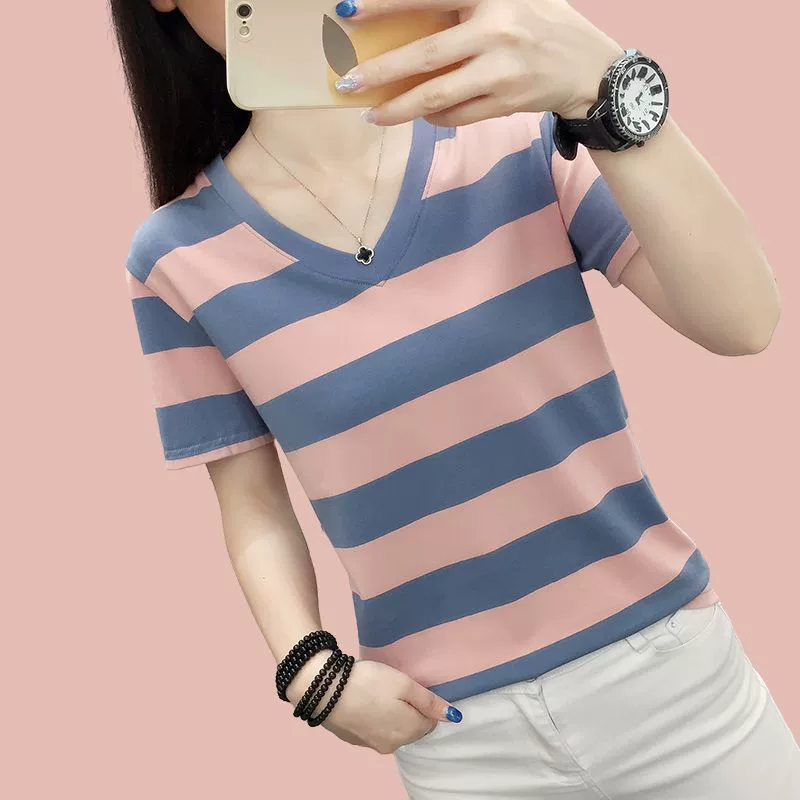 Front shoulder loose pure cotton high-end striped half-sleeved summer outfit