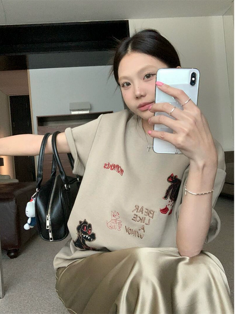 Smiling face embroidered T-shirt dress for women 2024 summer new large size loose lazy style short-sleeved long skirt
