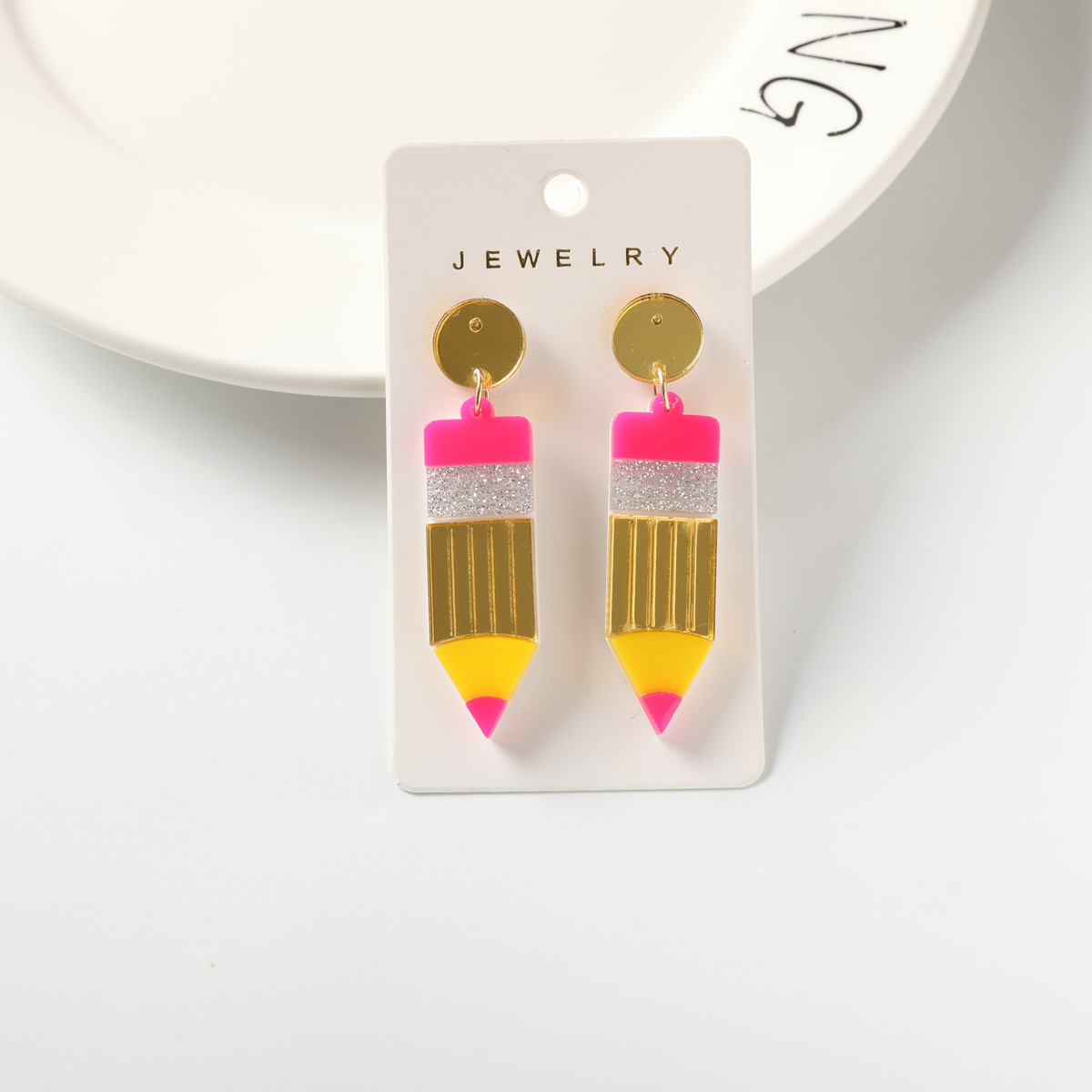 Cute Personalized Golden Mirror Pencil Acrylic Earrings Girls Retro School Season European and American Cross-border Earrings