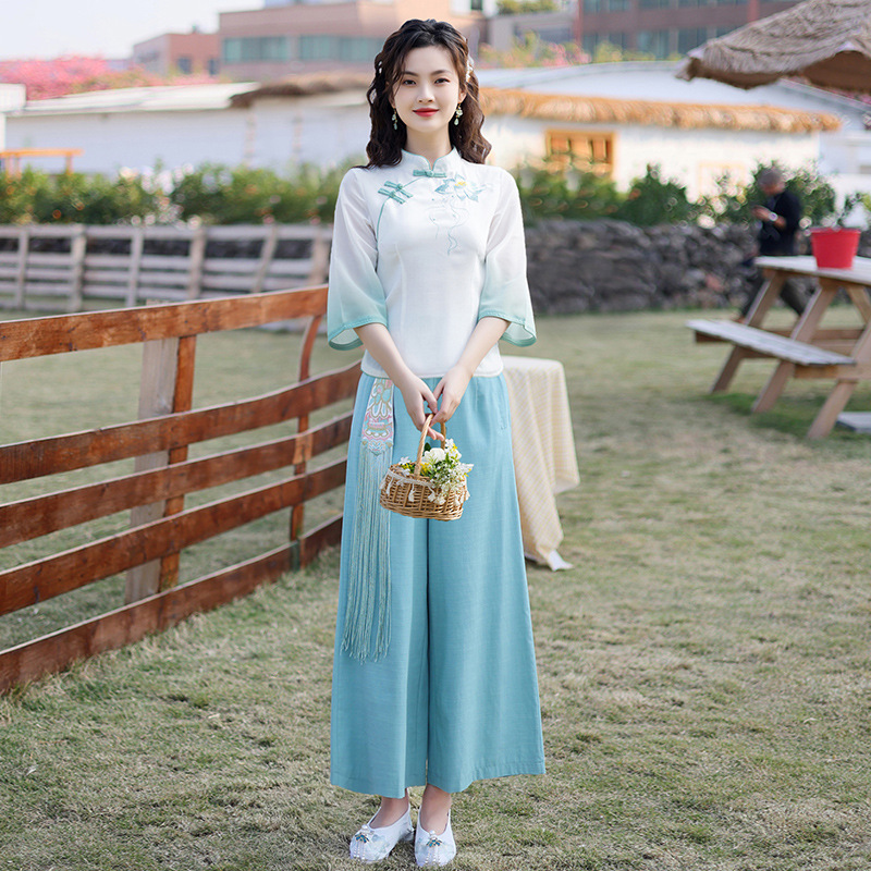Chinese style improved hanfu Chinese cheongsam Tang suit top tea clothes women’s spring and summer foot bath health center ear picking overalls