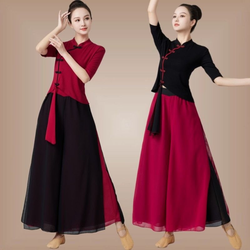 Square Dance Costume Cheongsam Classical Dance Rhyme Practice Suit Mesh Wide Leg Pants Chinese Dance Performance Costume ¥Cross
