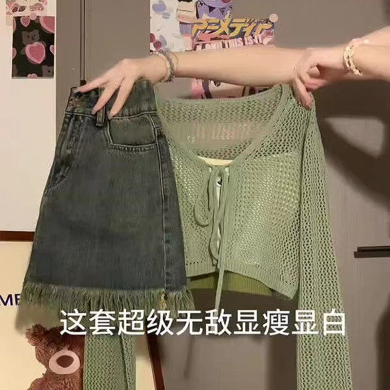 Summer gentle wearing a set of women’s 2023 new Korean version of the cardigan Denim skirt three-piece suit