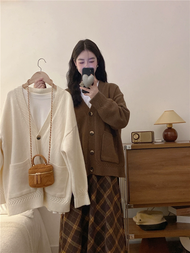 Large size retro long-sleeved T-shirt plaid knit jacket