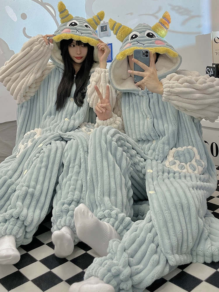 Coral velvet couple pajamas Women’s spring and autumn and winter 2024 new thickened pajamas autumn and winter men’s home clothing set