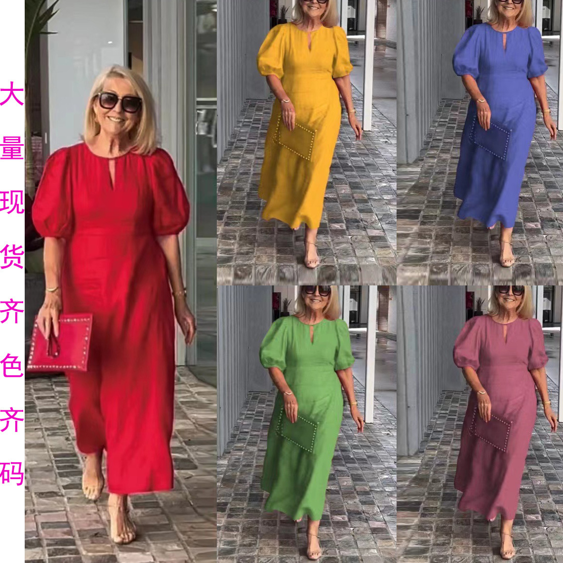 2024 European and American Cross-border Spring and Summer Independent Station Explosions Women’s Solid Color Loose Casual Crewneck Puff Sleeve dress
