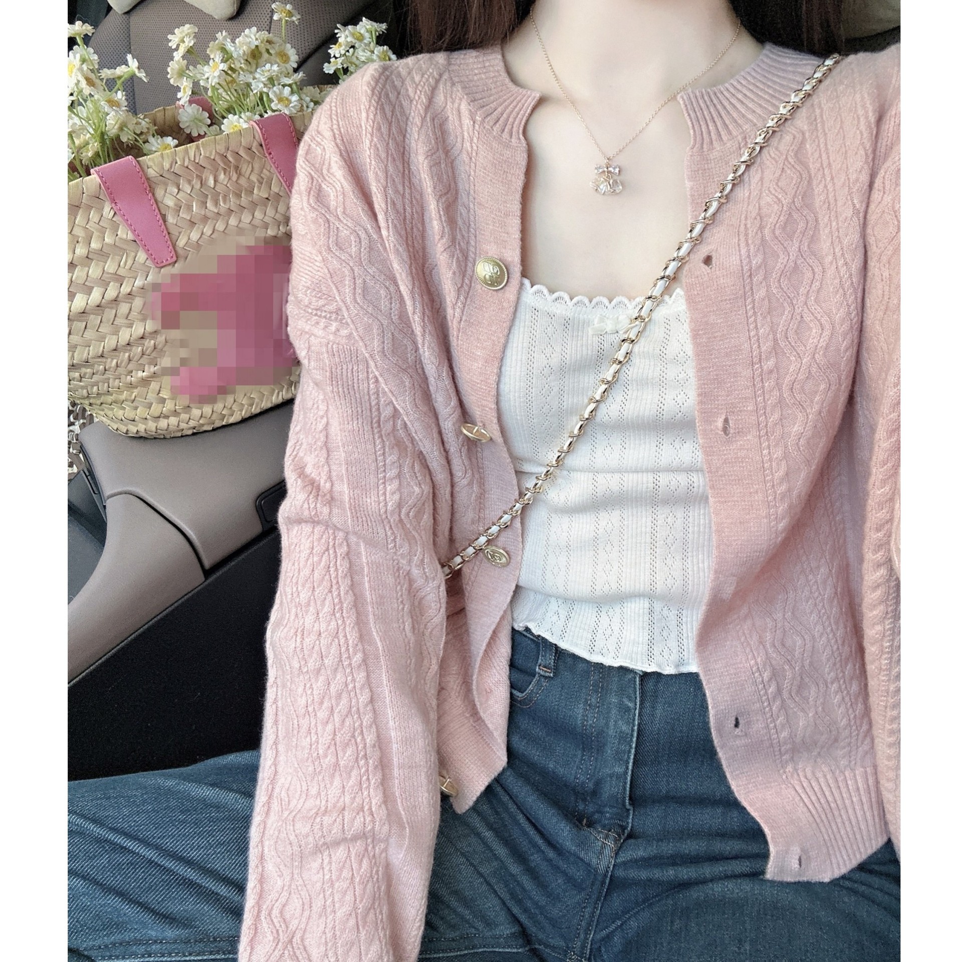 2024 early spring new elegant commuter twisted woolen sweater loose slimming round neck long sleeve gold buckle knitted cardigan for women