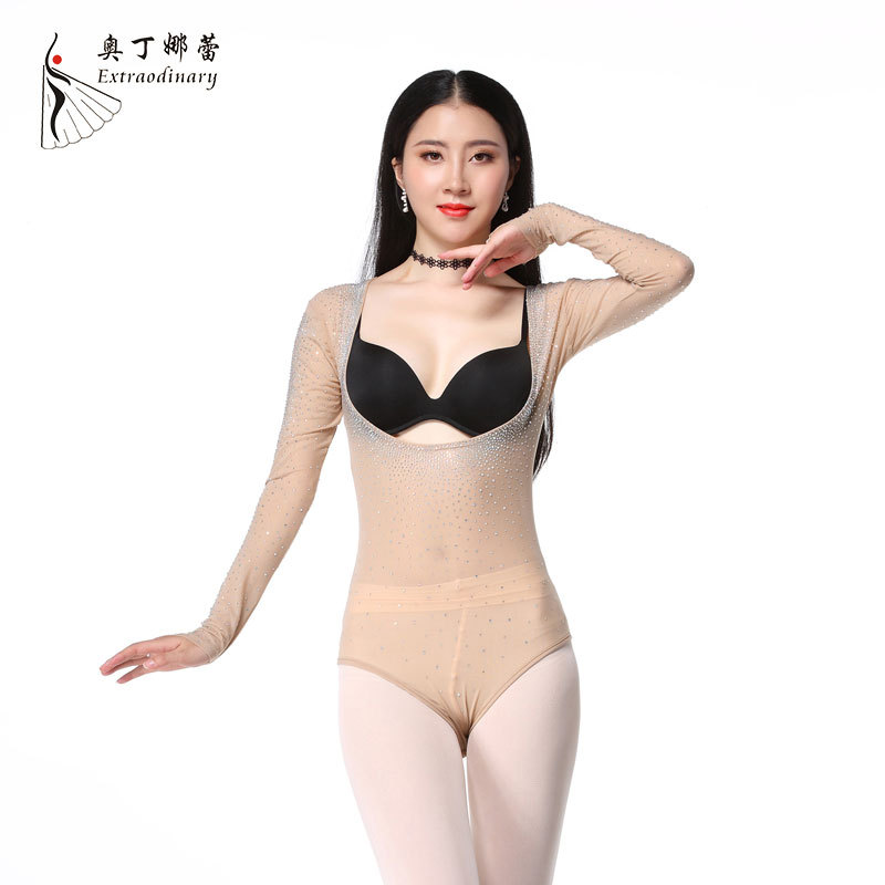 Odinale Belly Dancing Top with Diamond Long Sleeve Dancing Practice Base Mesh Adult One-piece Bracket Mesh