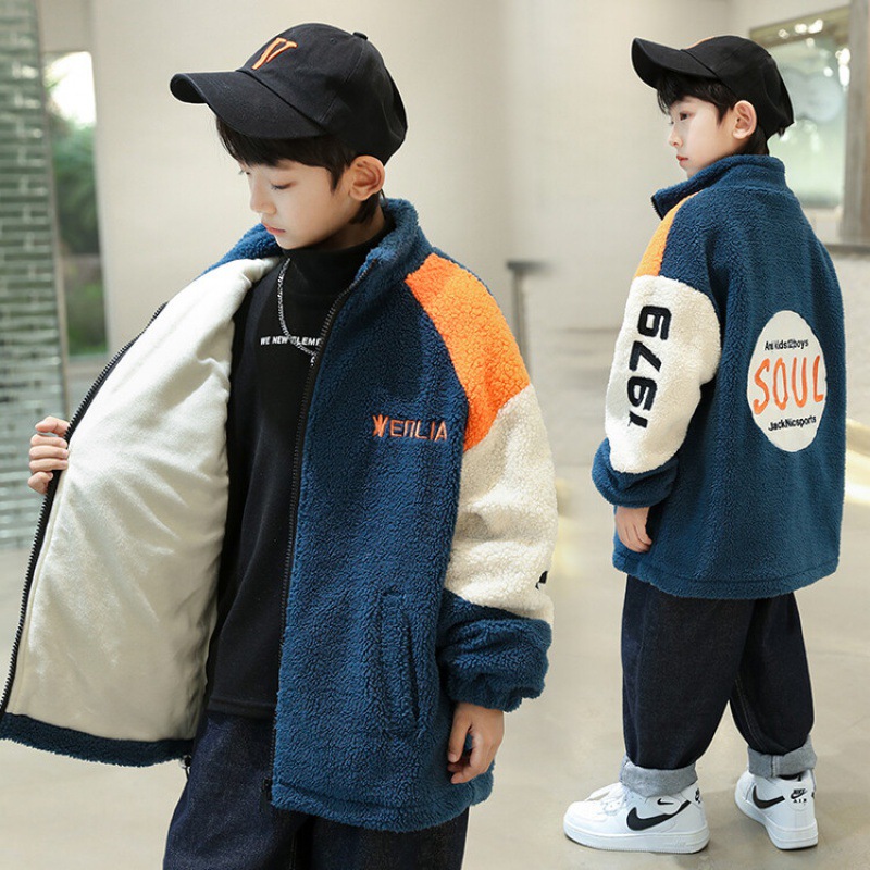Boys’ Velvet Coat Autumn and Winter Coat Lamb Velvet Thickened 2023 New Style Mid-Big Children’s Winter Boy’s Fleece Cotton Coat