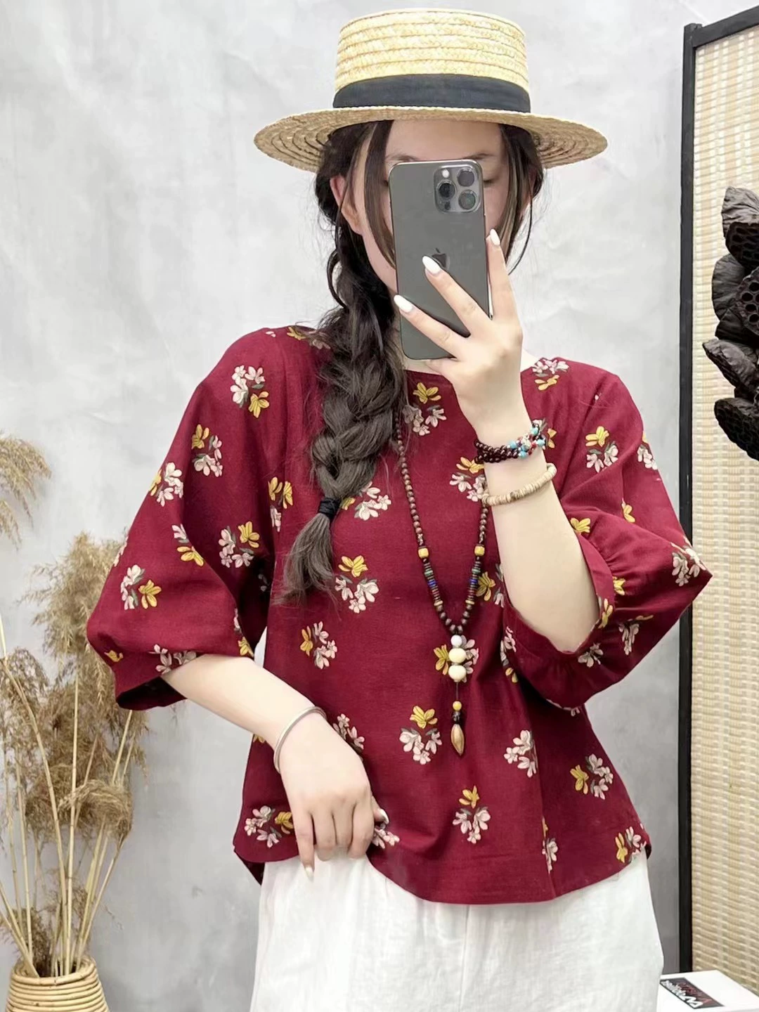 Cotton and linen floral lantern sleeves loose art breathable T-shirt