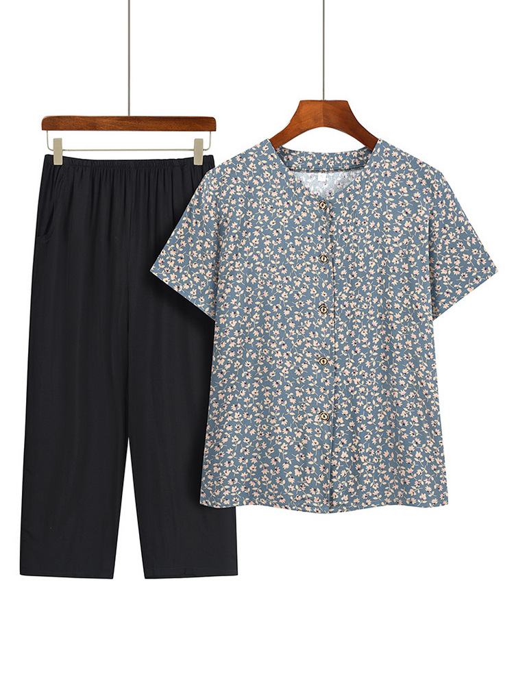 Middle-aged Summer Thin Cardigan Small Shirt Coat Mother Short-sleeved Top suit Grandma Loose Shirt Two-piece Set