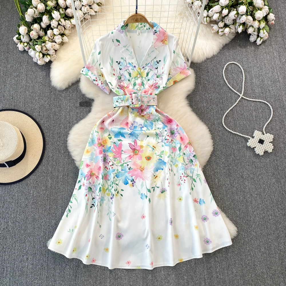 High-end light luxury ladylike temperament short-sleeved suit collar waist slimming A-line positioning printed dress dress summer