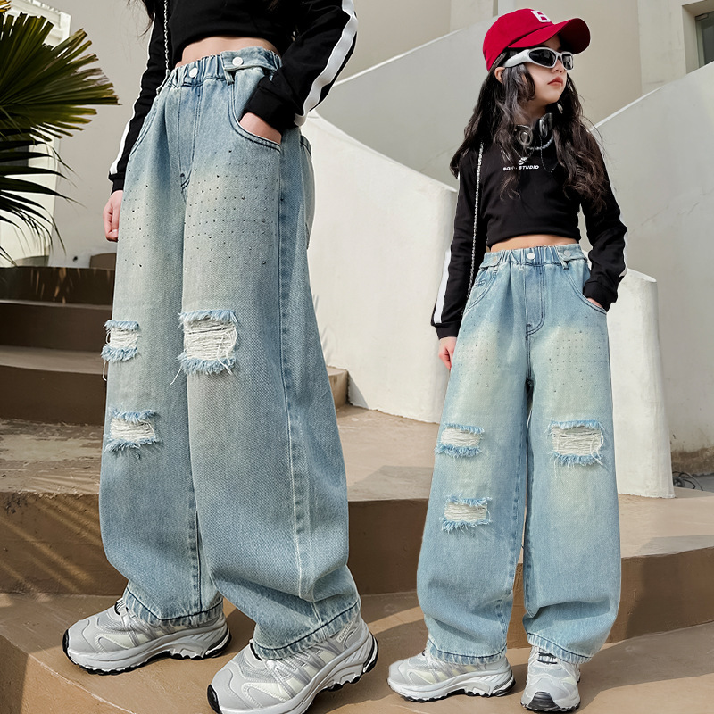 Children’s Wear Girls’ Jeans Spring and Autumn Big Children’s Spring Wide Leg Pants Fashionable Western-style Loose Trendy Cool Spring Fashion