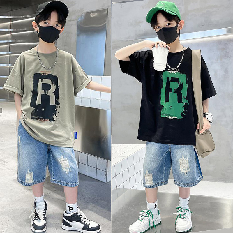 Boys’ 2024 New Summer Children’s Wear Children’s Cool and Handsome Summer Short-Sleeved T-Shirt Set Fashionable Middle and Big Children’s Two-Piece Set