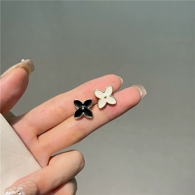 S925 silver needle niche design asymmetry black and white four -leaf earrings female INS style fashion versatile temperament earrings