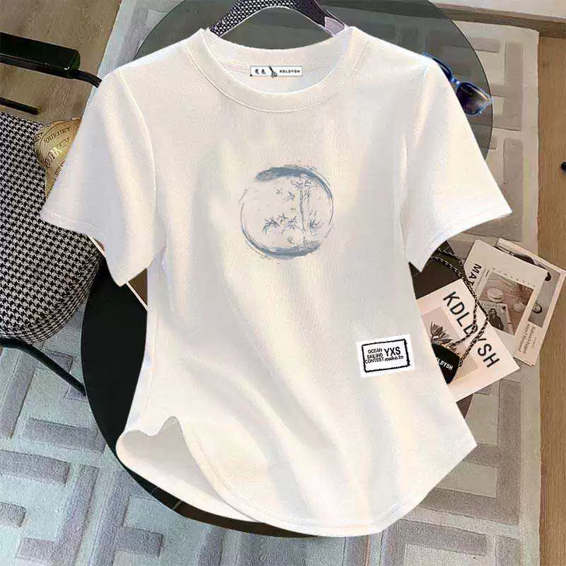 Pure cotton fashionable curved belly-covering right shoulder top with short sleeves
