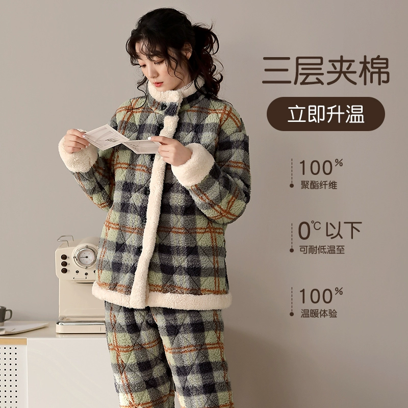 2023 winter stand-up collar pajamas for women, coral velvet quilted three-layer thickened plus velvet winter women’s cotton-padded jacket home clothes