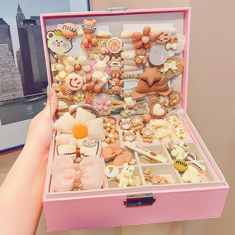 Children’s Hair Accessories Set Gift Box Cute Little Girl’s Milk Curry Color Hair Clip Hair Clip Birthday Gift Rubber Tendon Jewelry Box