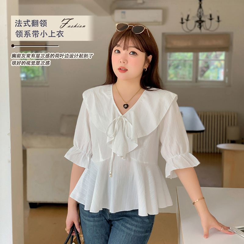 Double Day 2024 New Shirt Women’s Spring and Summer Large Size Women’s Clothing Chubby Sister French Lace-up Top L178
