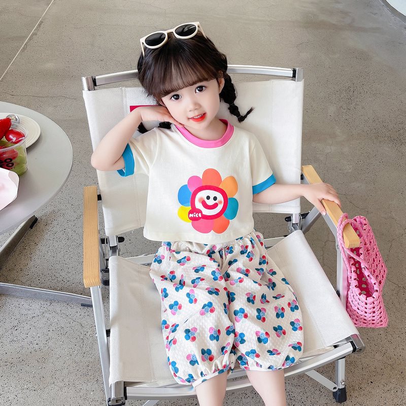 Female. Children’s Colorful Sunflower suit Summer New Baby’s Short-sleeved Printed Anti-mosquito Pants Casual Two-piece Set